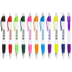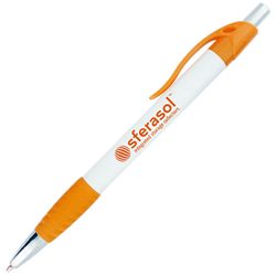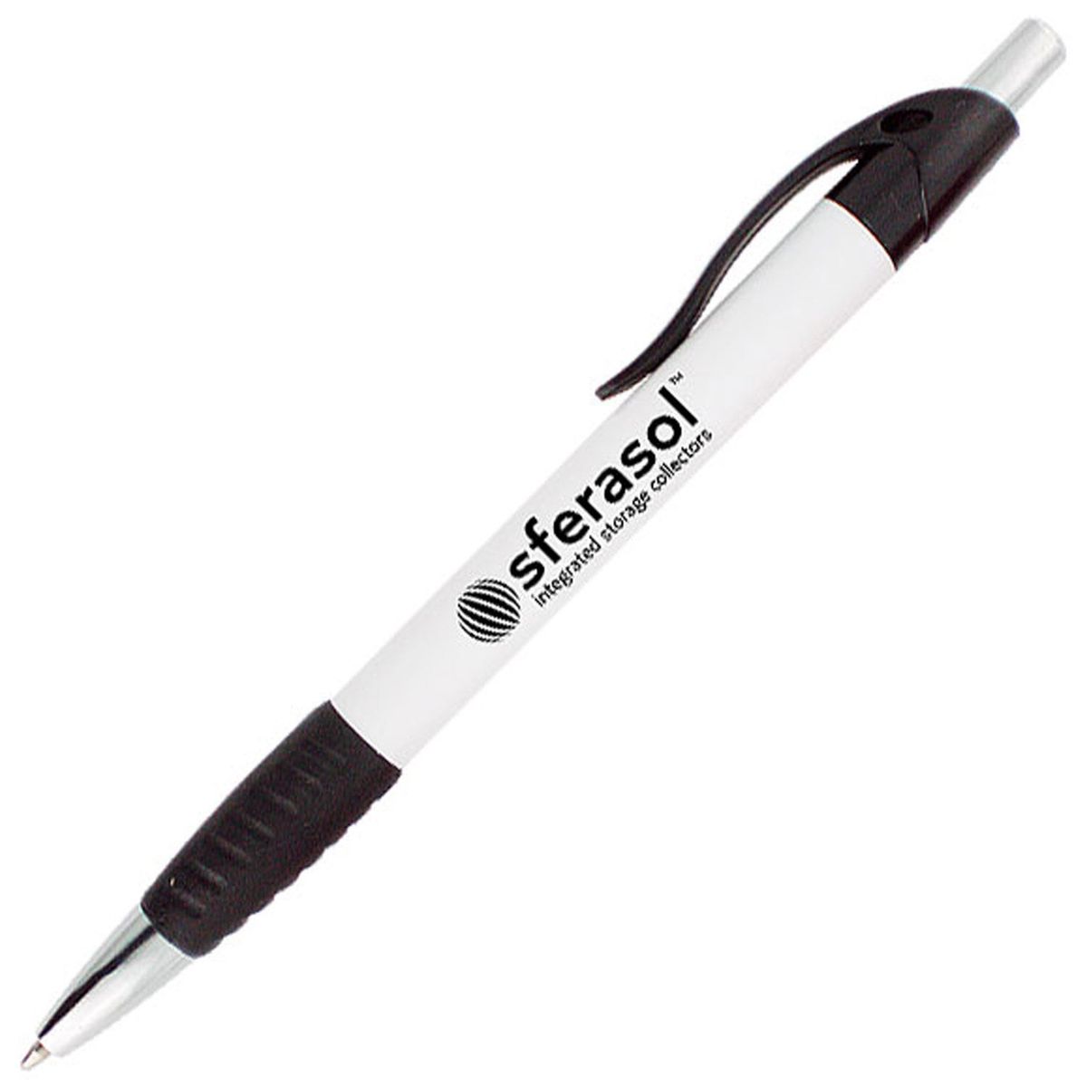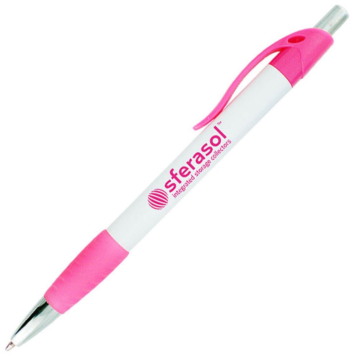 These custom imprinted Presto Gripper Pens are a fantastic way to get their business noticed. Featuring a solid white barrel with a colored rubber grip, matching clip and chrome trim. These can be incorporated into any promotion because they are simple but effective. Their sleek design and vibrant colors will make their event or promotion a great success!