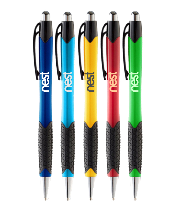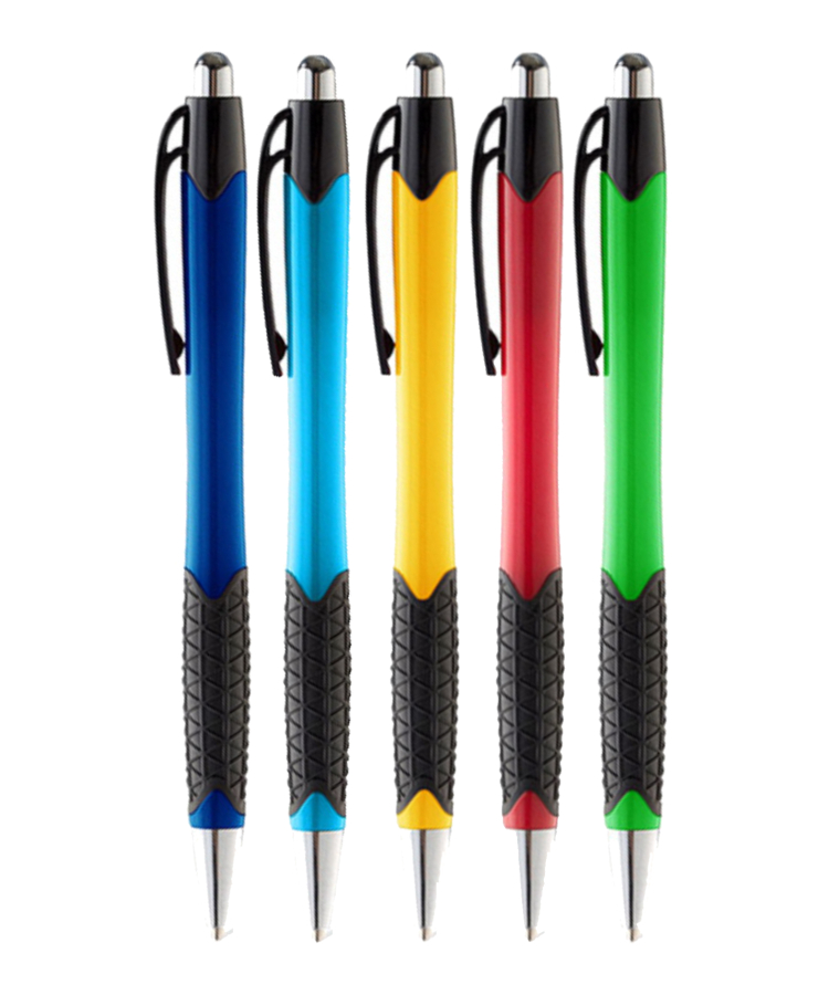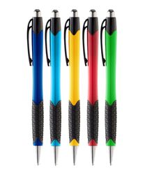 The Joe Grip Click Pen features vibrant colored barrels, a smooth retractable click mechanism, and a textured rubber grip for comfortable handling.