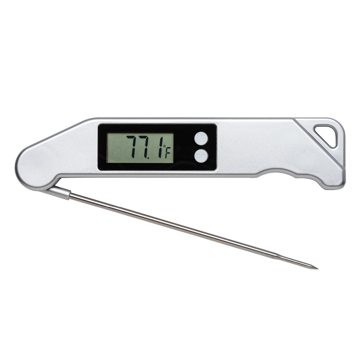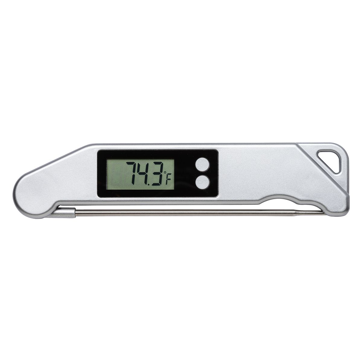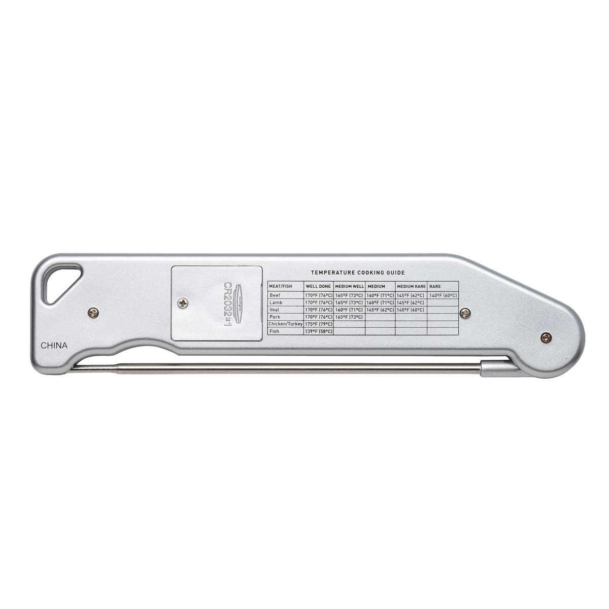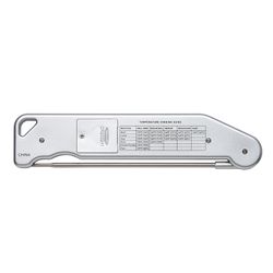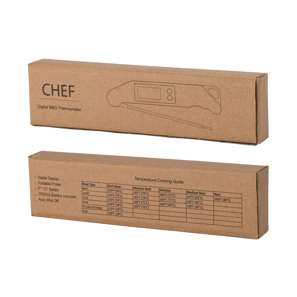 If you are tired of overcooking or undercooking your food, the Chef Thermometer is all you need for quick and accurate temperature checking. The 5 1/4" metal thermometer probe is foldable for easy storage and the digital display screen is easy to read and the temperature reading can be switched between Fahrenheit (°F) and Celsius (°C). Refer to the temperature chart printed on the back of the thermometer to gauge when your meat is cooked to perfection. Gift box and battery included.