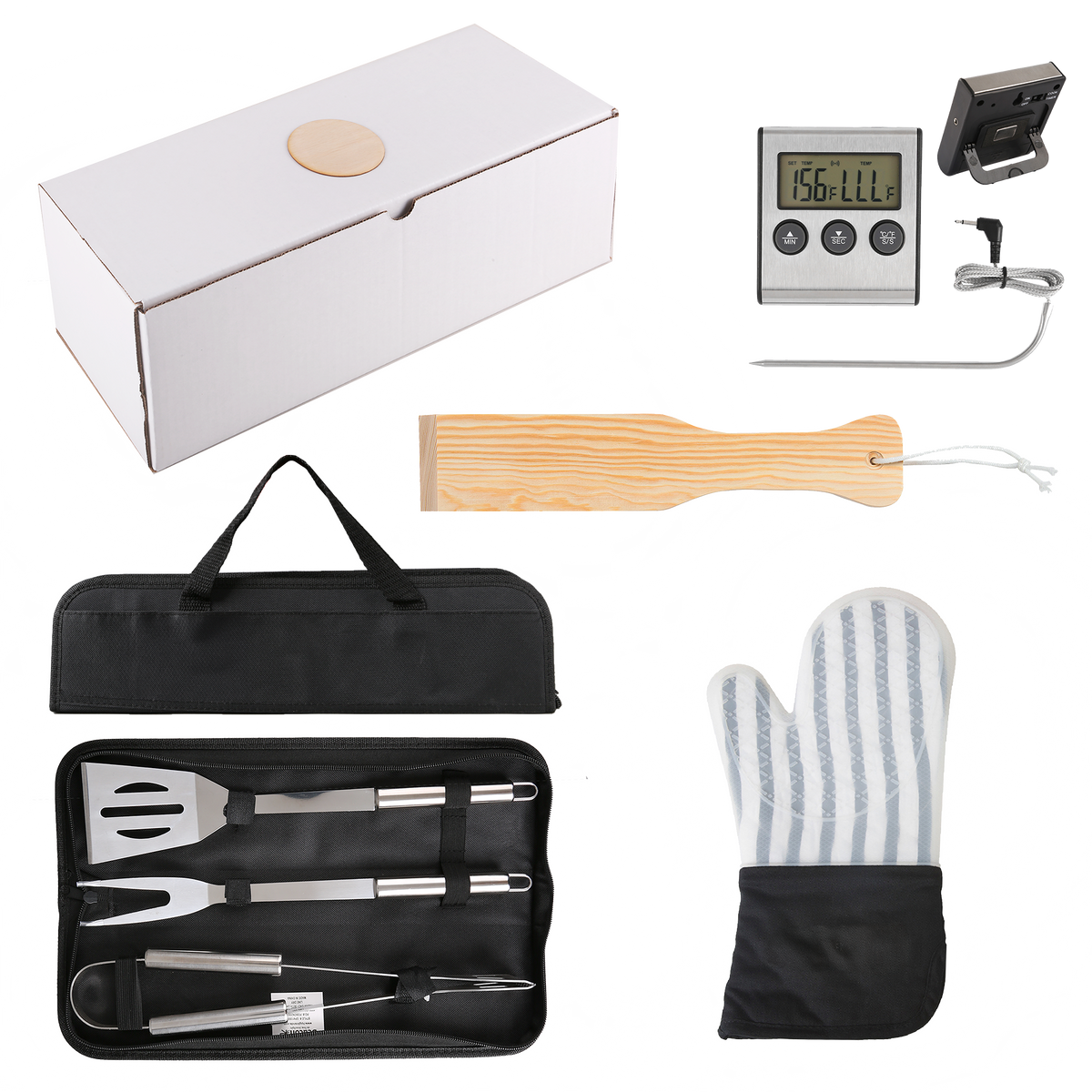 Grill to thrill with the Blazin’ BBQ Kit Deluxe! This kit has all the essential gadgets for a great BBQ, including a Frosted Silicone Oven Mitt, Grill Easy 3 Pc. Stainless BBQ Utensil Set with RPET Case, Grill Easy Cooking Thermometer and Timer, and a Pit Master BBQ Pinewood Grill Cleaner. It completes your grilling experience, enhancing the quality and convenience of every cookout, impressing guests, and creating unforgettable moments of joy and togetherness.