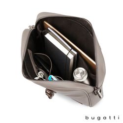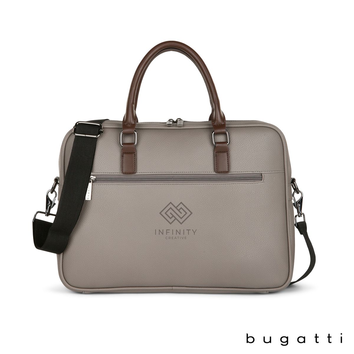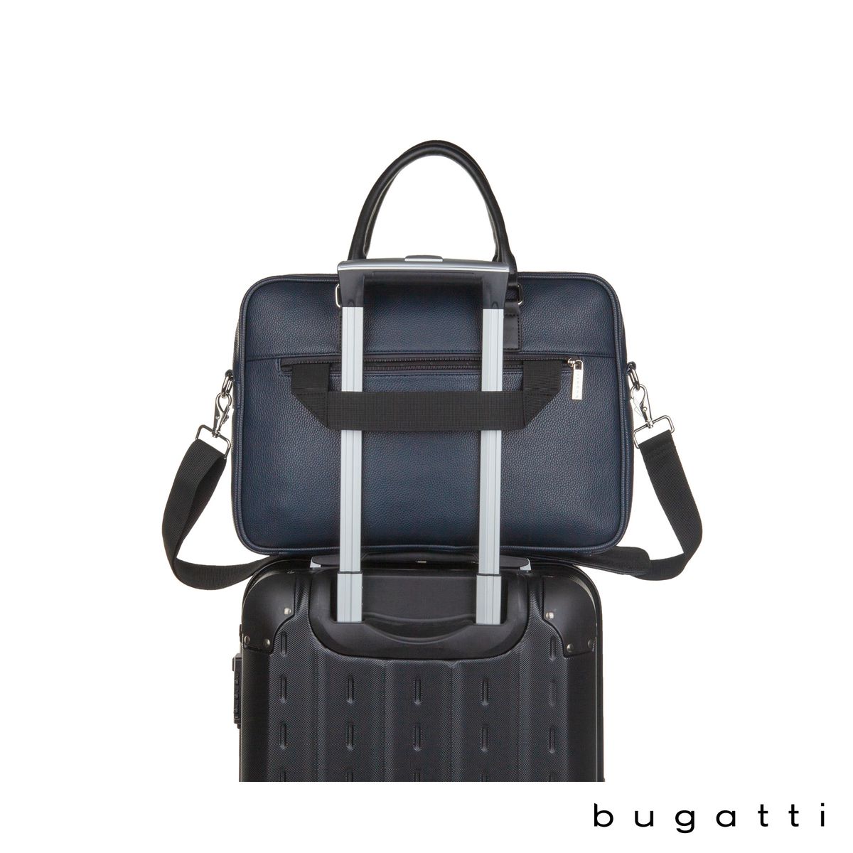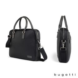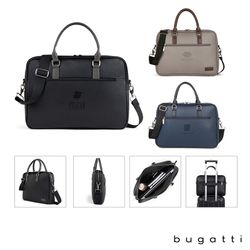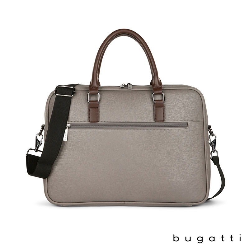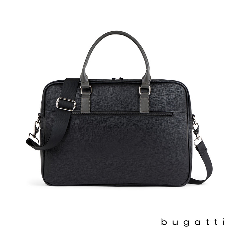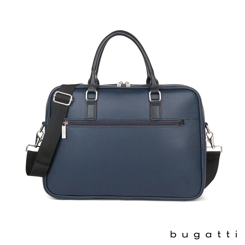 Enjoy your daily commute in style with the Bugatti Contrast Collection Briefcase. Made of durable pebble grain vegan leather and high quality hardware, this briefcase is designed to be the perfect everyday bag. Its reinforced handles, 1 1/2" x 48" adjustable and removable crossbody strap, and zippered exterior pocket with hideaway trolley pass-through strap make this briefcase the ultimate travel companion. The main zippered compartment features a padded laptop section that fits most laptops up to 14", a wide elastic bottle stabilizer, a multi-use built-in organizer for your smaller items and a large interior zippered pocket. This briefcase includes Bugatti zipper pulls and a two-year limited manufacturer warranty.