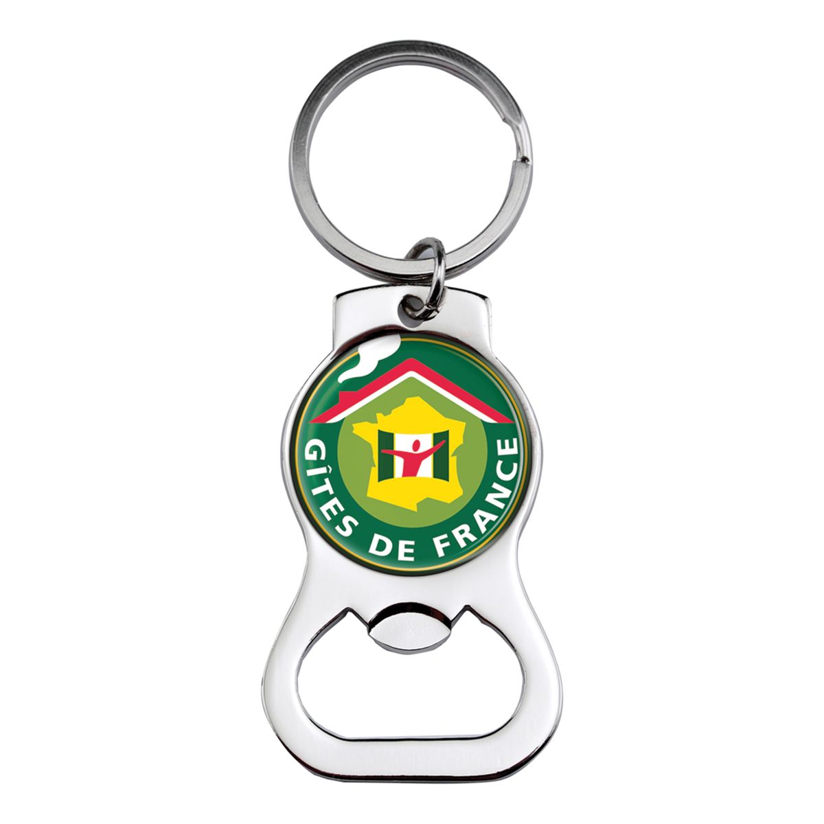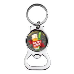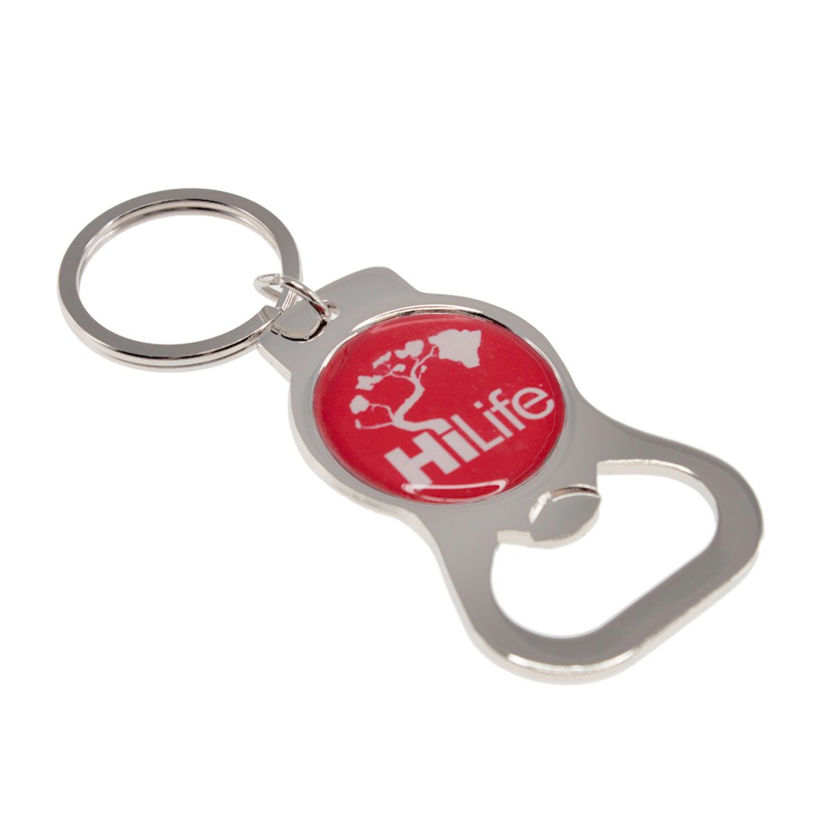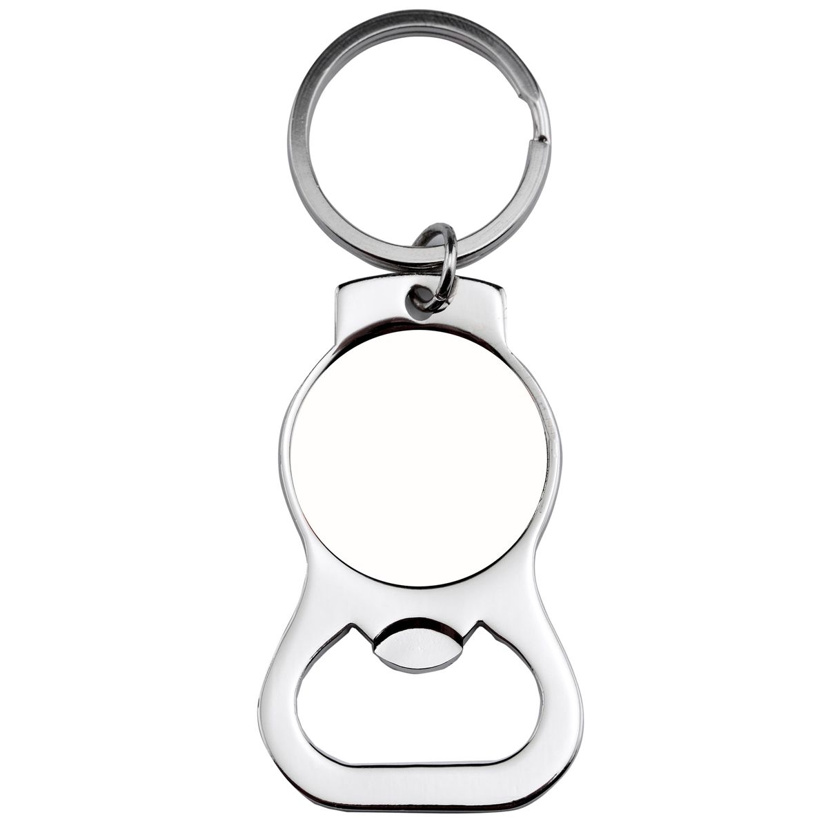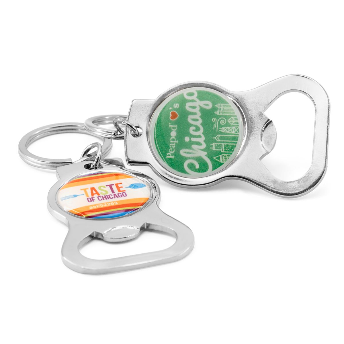 This economy metal bottle opener key chain makes a great promotional giveaway at special events and trade shows. The die struck design features a shiny nickel finish and full color imprint with protective poly dome. Adds a sturdy and handy bottle opener to your key ring and keeps your brand close at hand. Great for bar and beverage branding, breweries, restaurants and grand openings.