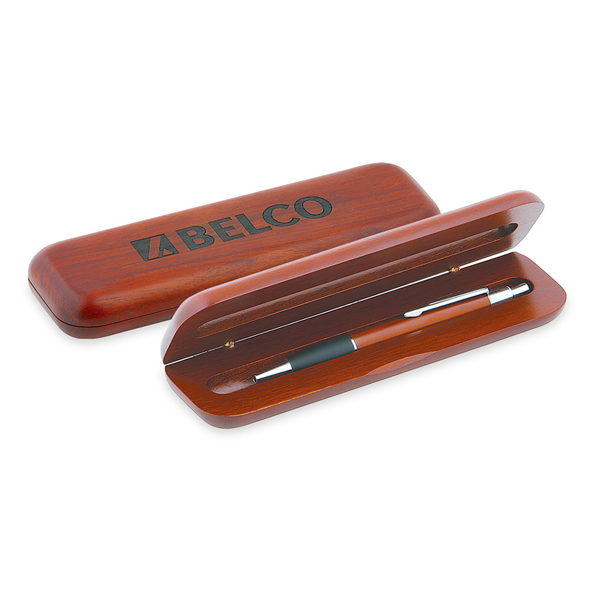 Introducing the WB01RSet2, an elegant wooden pen box featuring the WB01R case with RW-130B ballpoint pen. Crafted from quality coated natural wood showcasing unique grains per piece, this single pen box offers a sophisticated pen case ideal as a personalized wood pen or engraved pen set. This executive pen gift suits promotional wood pen needs, corporate pen set occasions, graduation pen gift, birthday wood pen, or groomsmen pen box. As a luxury pen set or collectible pen, it's refillable and eco friendly, fitting office pen gift collections or as a fancy pen box for journaling and signature tasks. The pen presentation box enhances its appeal as a writing instrument gift for any professional or enthusiast. The twist ballpoint pen provides smooth writing, convertible to gel ink, with black ink or blue ink options. Perfect for laser engraved customization in natural wood (black color fill available), full color process, or silkscreen imprinting.
