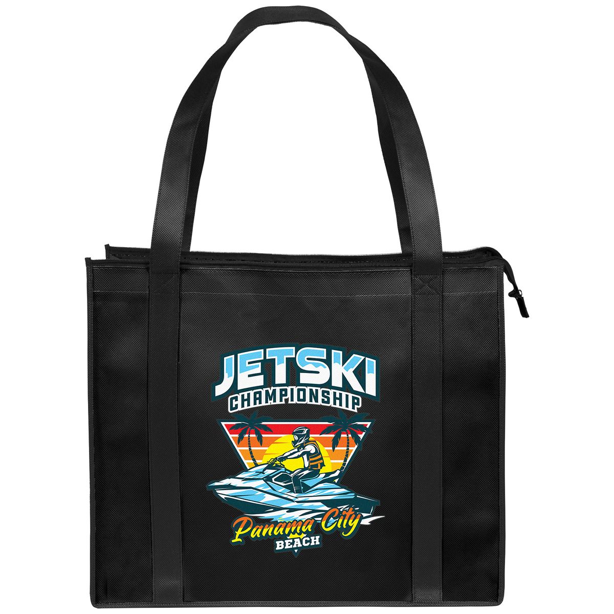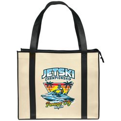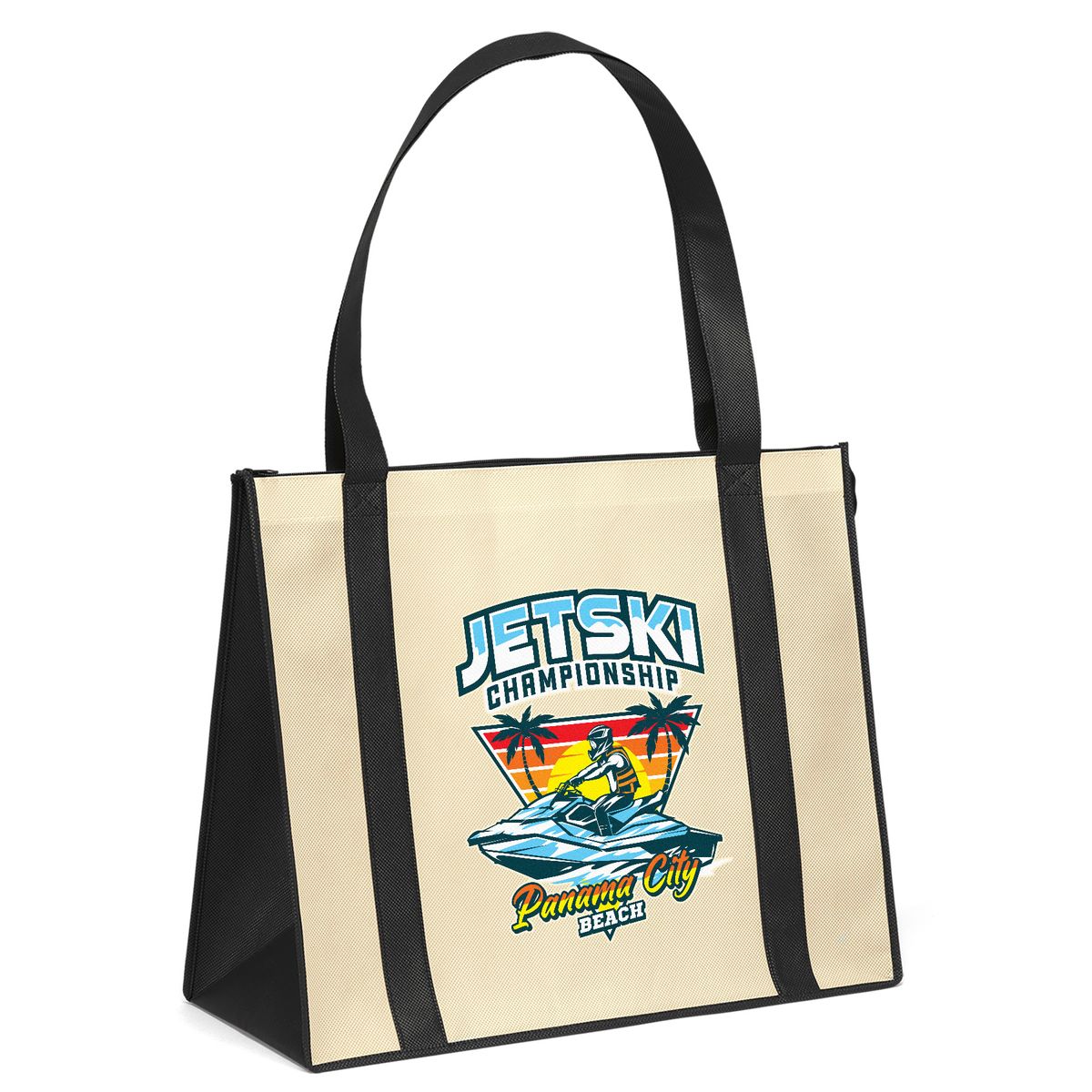 The budget friendly Del Mar Tote offers a classic, roomy design paired with a convenient zipper close top and plastic bottom insert. The Del Mar is made with premium 100 GSM non-woven material and is available in two colors: Natural with contrasting Black handle and panel trim, and all-Black.