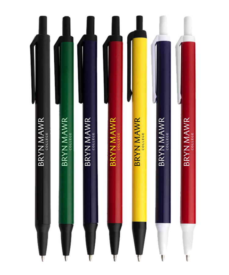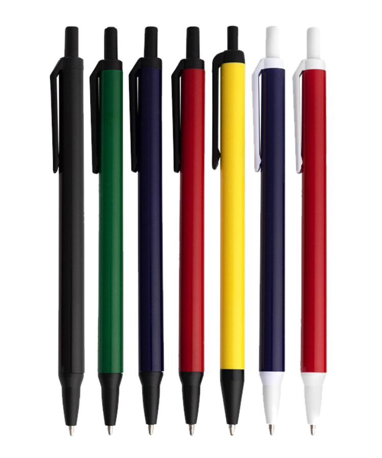 This stick-style click pen features a sleek barrel with an integrated clip and delivers smooth, consistent ink flow.