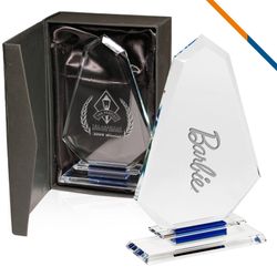 Acknowledge every achievement with these Talo Awards! Made of clear crystal glass with subtle blue accents, each award measures 9" x 5.75" x 0.4" and comes with a three-layered base and a gift box for an elegant touch. There's plenty of room to add an imprinted recipient's name, company logo and message. These awards will leave a lasting impression and a cherished symbol of accomplishment!
