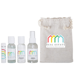 Gift a spa treatment with all the essentials. This relaxing kit offers a 5x7 jute bag with a generous imprint area, with a natural beeswax lip moisturizer, a 2 oz refreshing fabric freshener spray, a 1 oz lotion, and a 1 oz Moisturizing Hand Sanitizer. Made in the USA with global materials.
