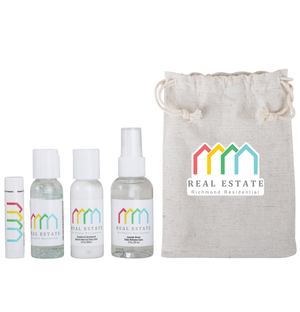 Standard Decoration Includes: One Color Screen Print on Jute Bag, Full Color Label on Fabric Spray, Hand Sanitizer, Lip Moisturizer & Lotion