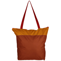 This bag is made of solid colored denier PVC backed polyester material, has 28" handles, and measures 16"H x 18.5"W x 6"D.